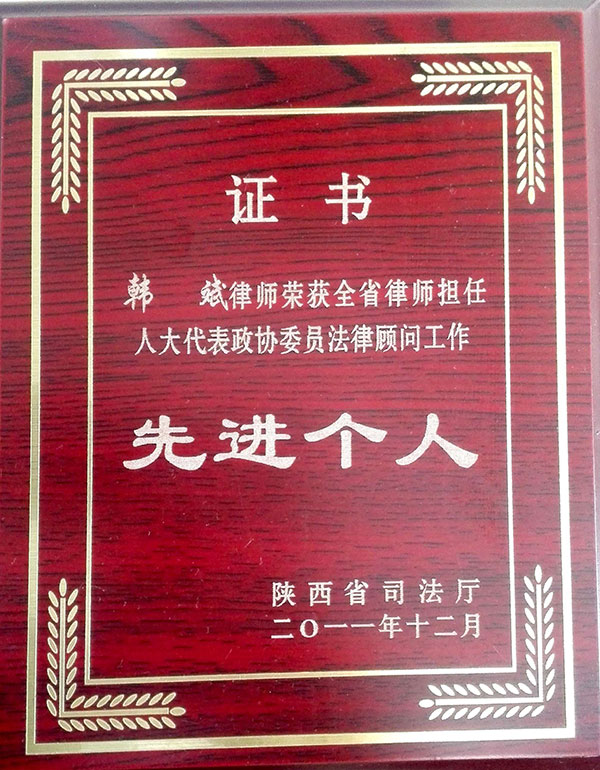 韩斌律师荣获全省律师担任人大代表委员会法律顾问工作